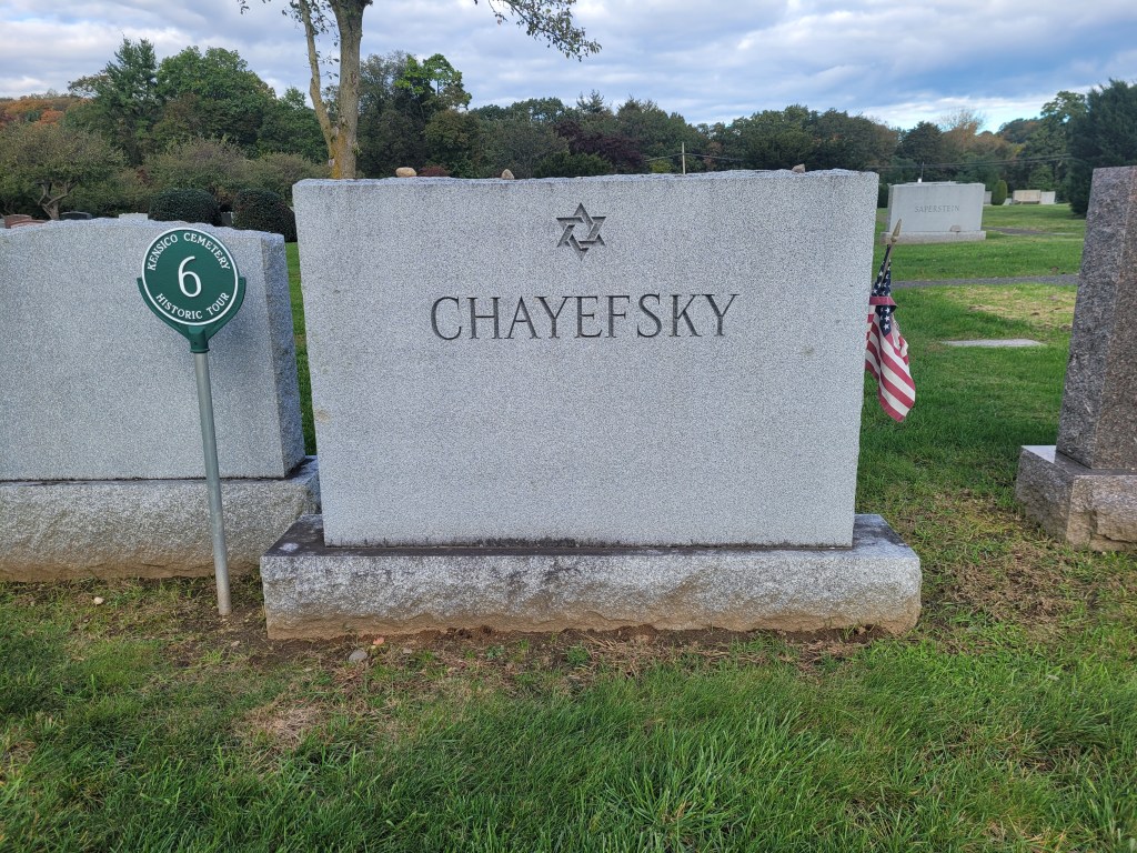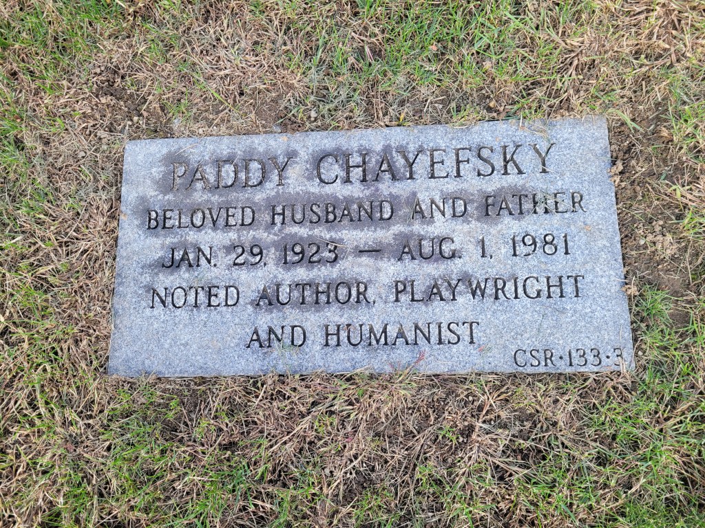 Novelist, playwright, and screenwriter Sidney Aaron “Paddy” Chayefsky is buried in Sharon Gardens. He is known for writing the screenplay of the 1976 critically acclaimed film “Network,” which offers a satirical look at the chaotic realm of network television.