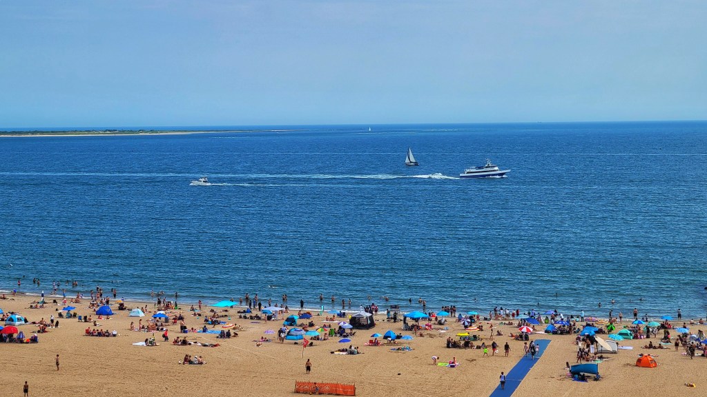 We make our way back through the beach. As we stroll along the sandy shore, the cool ocean breeze brushes against our skin, offering a welcome respite from the bustling crowds behind us. The rhythmic sound of the waves crashing against the shore soothes our souls, as we take in the peaceful serenity of the beach. The boats bobbing in the distance seem to dance on the glimmering surface of the water, their colorful sails adding a touch of whimsy to the tranquil scene. It’s a stark contrast to the noisy chaos of the boardwalk, a reminder of the beauty and tranquility that nature has to offer.