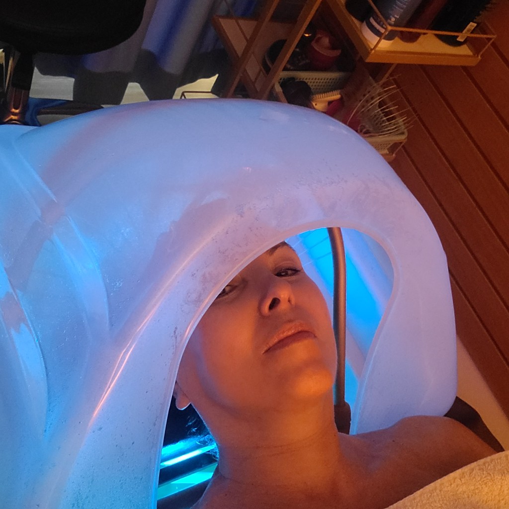 Then, a clear plastic hood was placed over my head for an aromatic round of hair steaming. Candy explained that this process is designed to help repair damage, infuse my hair with moisture, and improve hair elasticity, making it less prone to breakage and split ends.