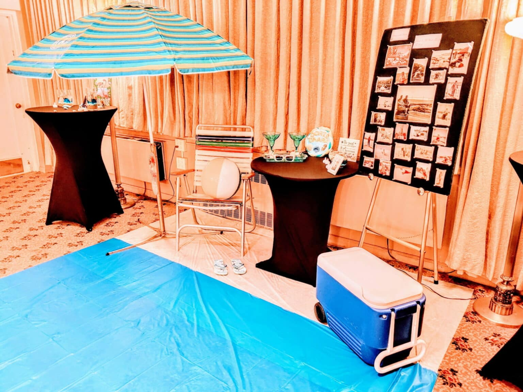 “We set up memory tables with beach-inspired items,” he explained. Rizzotto and his team carefully spread out a blue tarp to resemble ocean water, adding a beach chair, umbrella, and a cooler filled with iced tea and soft drinks.